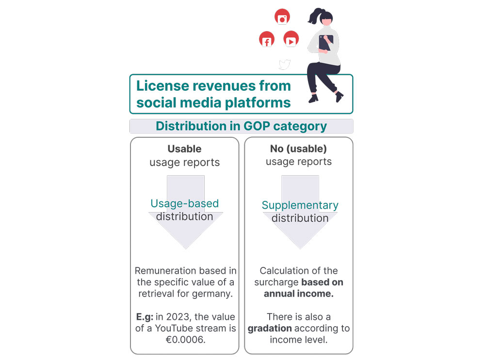 Distribution is based on the dual distribution model. On the one hand, direct distribution takes place if usage reports are available and complete. On the other hand, missing and insufficient reports are compensated for by a supplementary distribution across almost all categories.