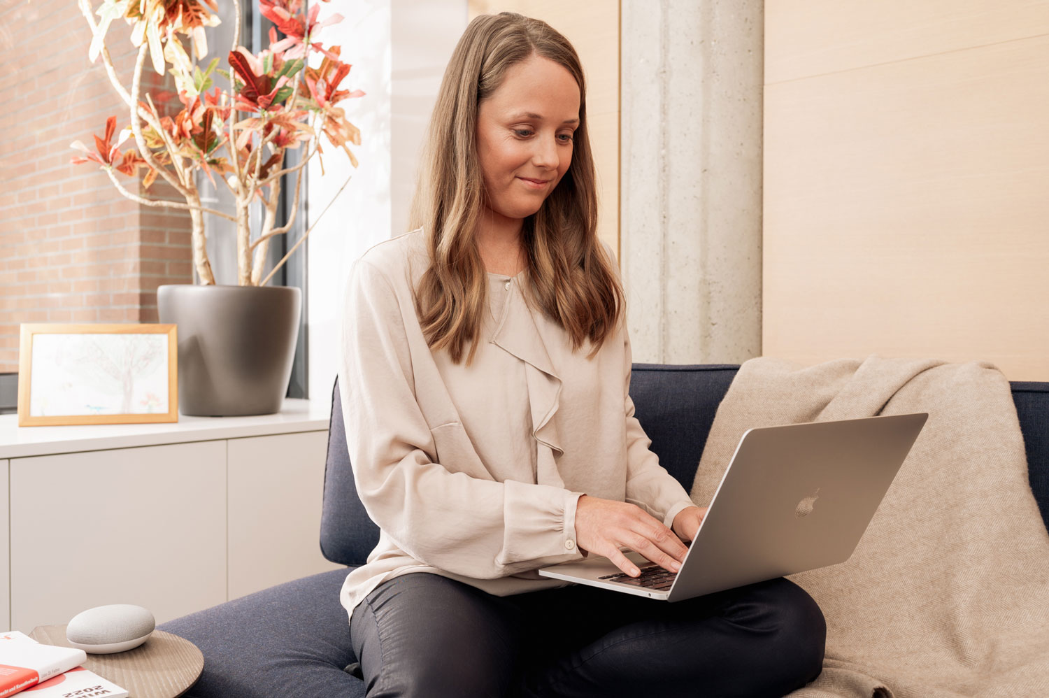 Eine Frau tippt auf einem Laptop, sitzt auf einem Sofa, im Hintergrund eine Pflanze und ein Bildrahmen.