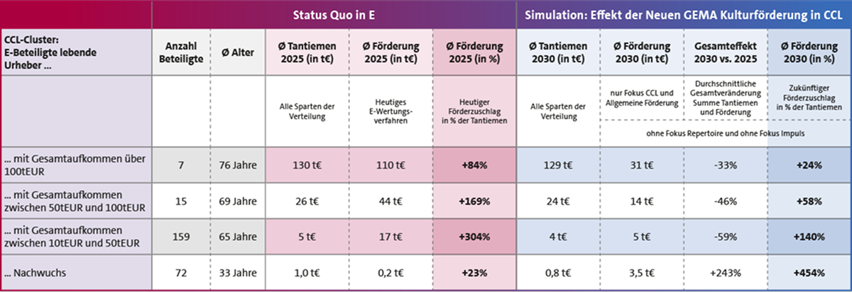 Die beschriebenen, gegenüber dem heutigen E-Wertungsverfahren reduzierten CCL-Fördermittel führen bei etablierten E-Urhebern im Regelfall zu einem Rückgang des Förderfaktors, während der CCL-Nachwuchs deutlich profitiert. Das Tantiemenaufkommen ist im Durchschnitt zwar leicht rückläufig - aktives zeitgenössisches Repertoire kann jedoch von der neuen CCL-Direktverteilung profitieren.